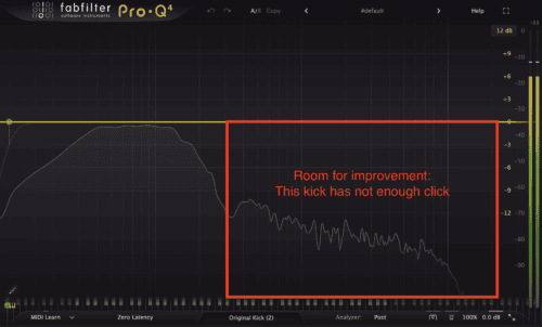 Or remember the click-less kick from our earlier example image, in the image below we’re using the new kick layer (in grey) only for it’s top-end by carving out the lows and boosting the frequency of the click. Meanwhile the original kick (in red) can will out the low-end on it’s own.