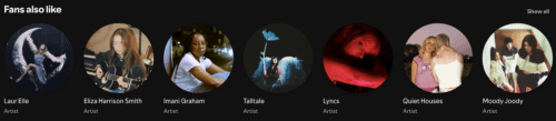 - Go through their “Fans also like” and repeat; this way, you find a lot of similar artists in your niche that you can contact later.