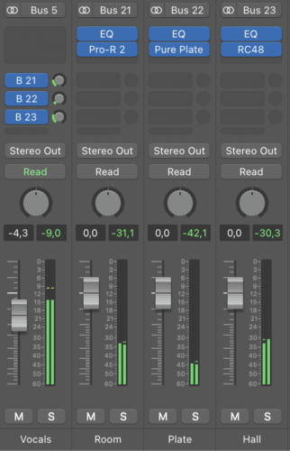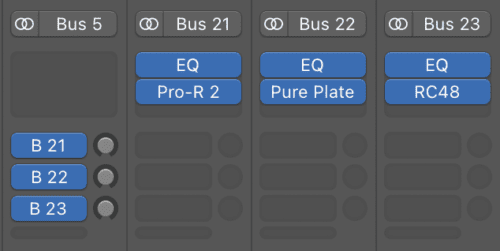 - Create busses or auxiliary sends (which are essentially the same in this context) and place one reverb type on each send. Using sends allows you to share the same reverb across multiple tracks, saving CPU and creating a more cohesive space.